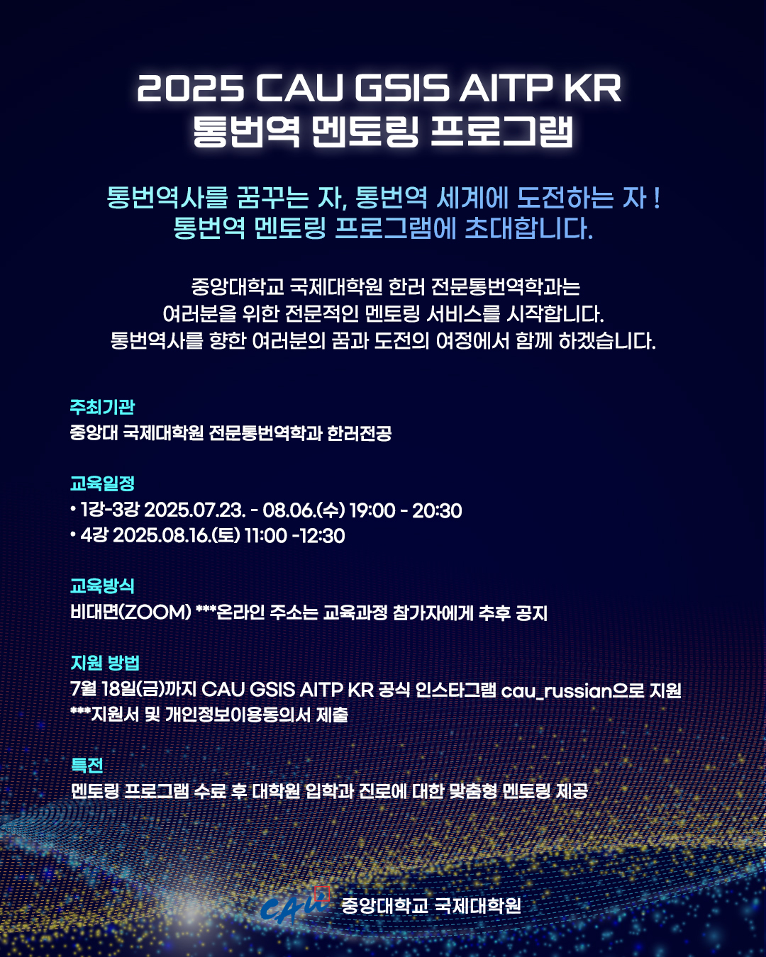 - 지원방법: 7월 18일(금)까지 CAU GSIS AITP KR 공식 인스타그램 cau_russian으로 지원